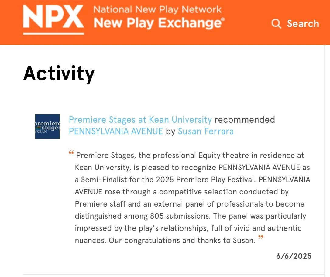 Thank you, Premiere Stages! My play PENNSYLVANIA AVENUE is a semi-finalist for the 2025 Premiere Play Festival!
